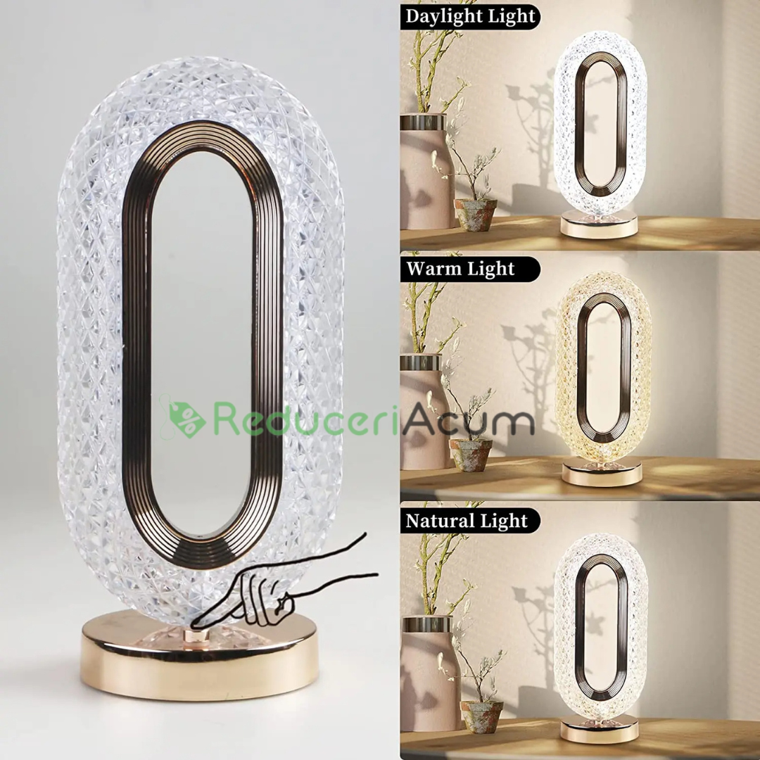 Design Elegant: Forma ovală și finisajul din cristal creează un efect vizual spectaculos, transformând orice cameră într-un spațiu sofisticat și primitor.