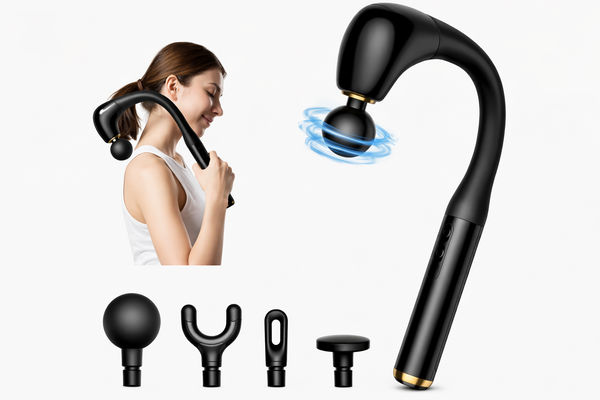 Aparat de masaj percutant în formă de L – 5 Viteze, Capete Interschimbabile, USB-C, 10W