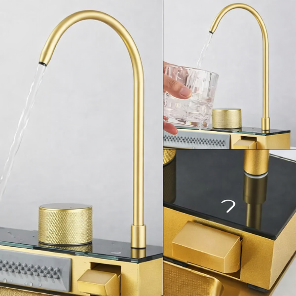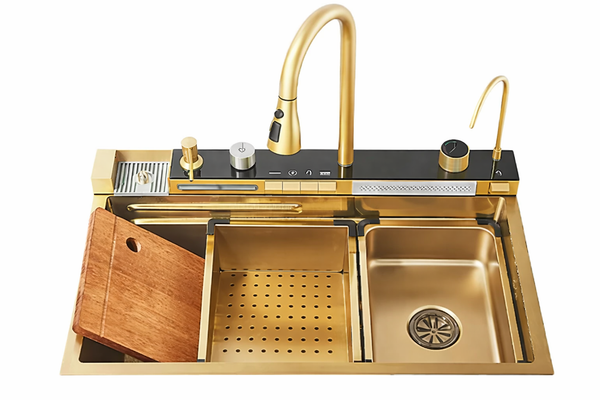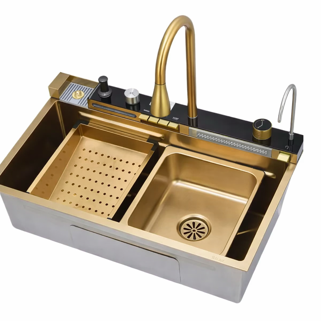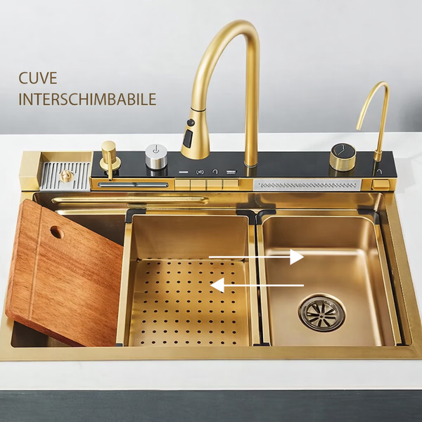 Chiuveta Multifunctionala LEIHMANN pentru bucatarie cu 2 cascade, accesorii incluse, afisaj digital pentru temperatura si robinet cascada, culoare gold, 750x460x220mm