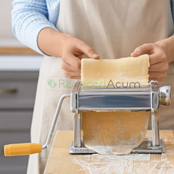 Pregatiti mai intai toate ingredientele necesare pentru pastele visurilor dumneavoastra. Apoi framantati aluatul, impartiti-l in bucati si intindeti-l usor. Apoi, puneti aluatul in partea din fata a masinii. Aparatul va aplatiza aluatul pana la grosimea corecta setata. Acum introduceti manivela in deschiderea din fata. In cele din urma, puneti aluatul aplatizat in lama aleasa de dvs. si potriviti manivela pe ea.