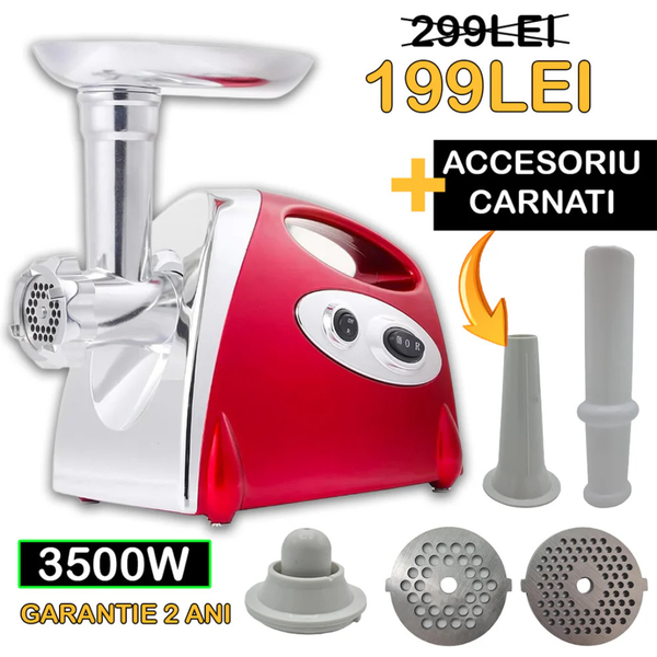 Mașină de Tocat Carne Electrică 3500W cu Accesoriu pentru Cârnați – 2 Site Inox, 2 Ani Garanție