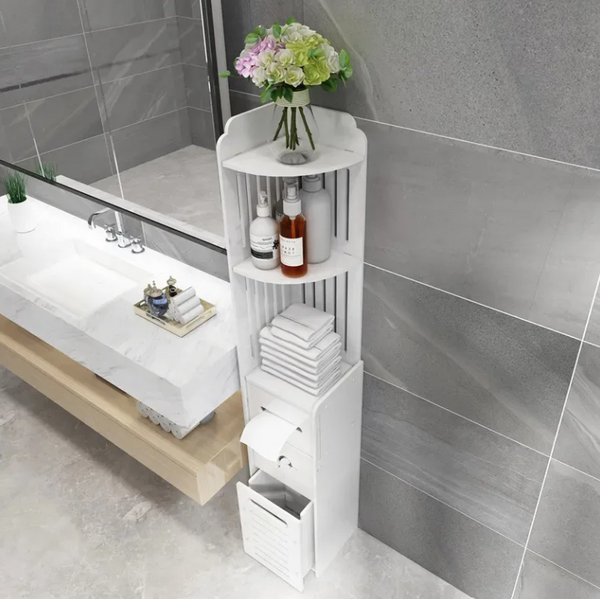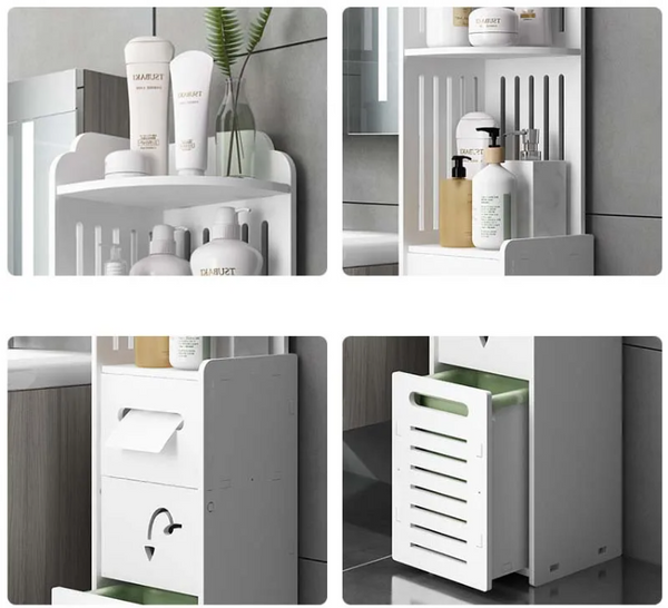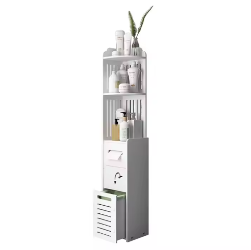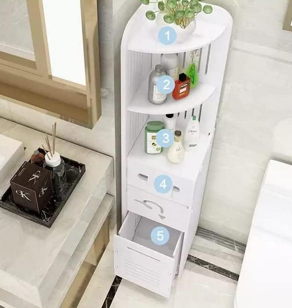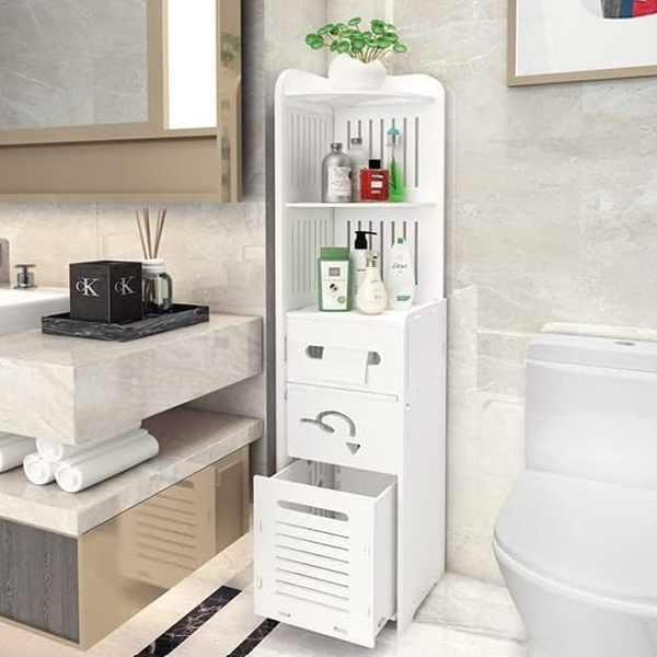 Utilizare multifuncțională – Poate fi folosit și ca suport pentru hârtie igienică, noptieră îngustă pentru dormitoare mici, sau suport pentru plante în colț. Raftul superior deschis este perfect pentru a ține plante mici pe balcon.