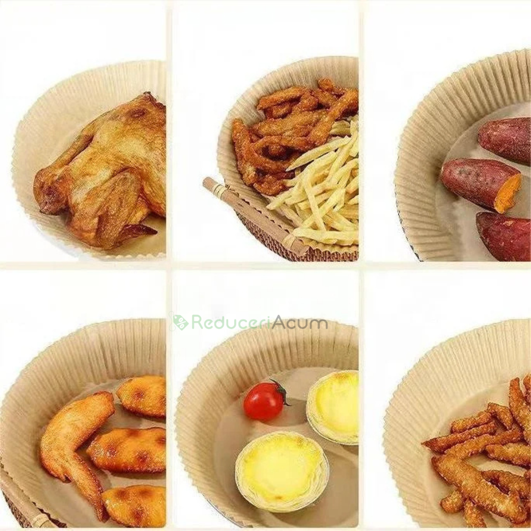 hartia de copt de unica folosinta pentru friteuza mentine friteuza la fel de curata ca inainte de utilizare si previne sa ramana resturile de alimente si petele de grasime pe vasele de gatit.
