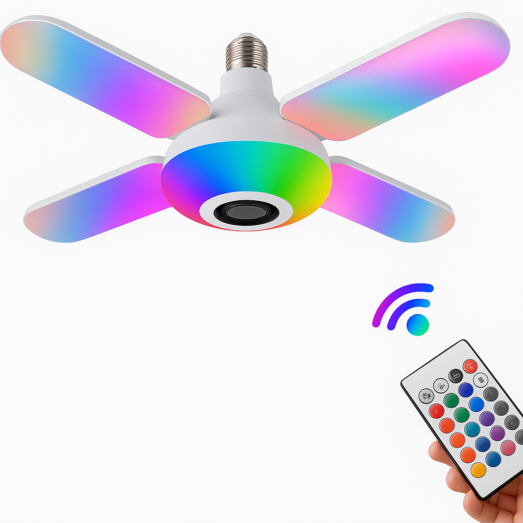 Descoperă combinația perfectă între lumină, sunet și confort cu Becul LED cu 4 elice, boxă Bluetooth încorporată și telecomandă. Acest bec inteligent multifuncțional transformă orice încăpere într-un spațiu plin de viață și culoare. Datorită iluminării RGB, poți schimba cu ușurință între milioane de culori pentru a se potrivi oricărei atmosfere — de la lumini calde și relaxante până la efecte dinamice pentru petreceri.