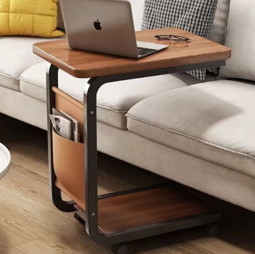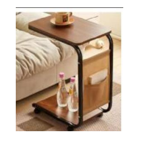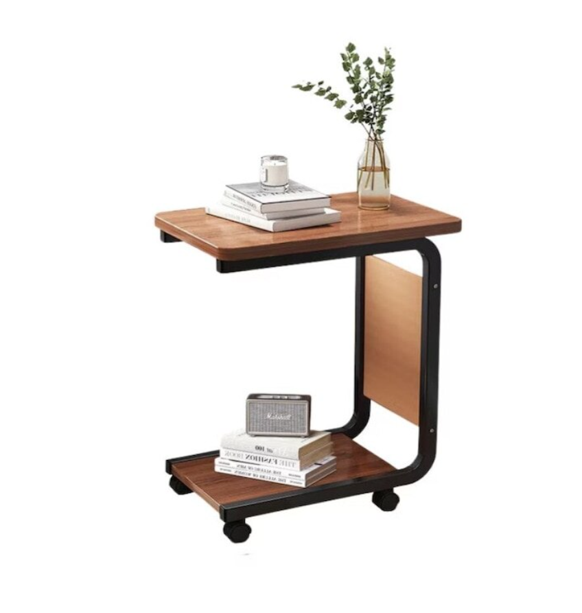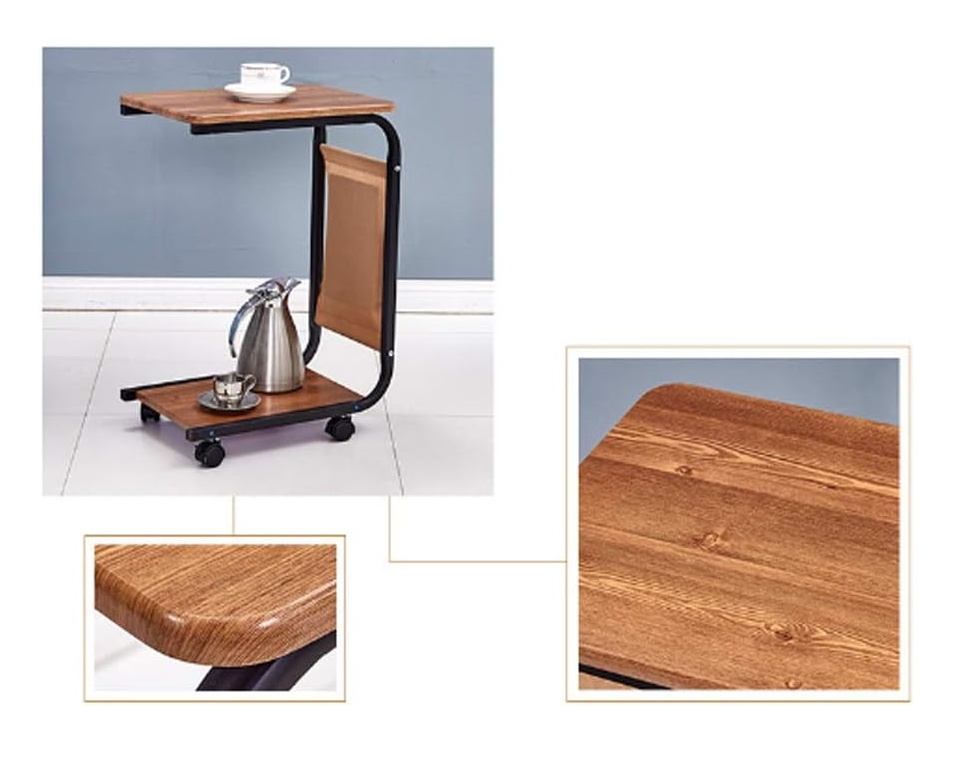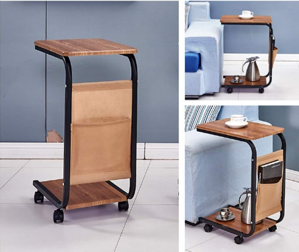 Culoarea caldă maro a suprafeței din lemn oferă o notă naturală și confortabilă, în timp ce cadrul metalic negru adaugă stabilitate și un contrast estetic plăcut. Polițele spațioase sunt perfecte pentru cărți, reviste, decorațiuni sau alte obiecte personale, iar buzunarul lateral textil oferă un spațiu suplimentar, practic și ușor accesibil.