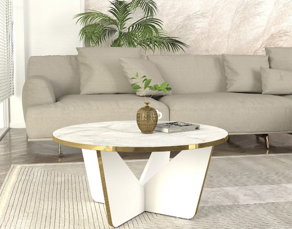 Baza unică în formă de V, realizată din pal melaminat alb, contrastant cu detaliile aurii, oferă stabilitate și un punct focal atrăgător.