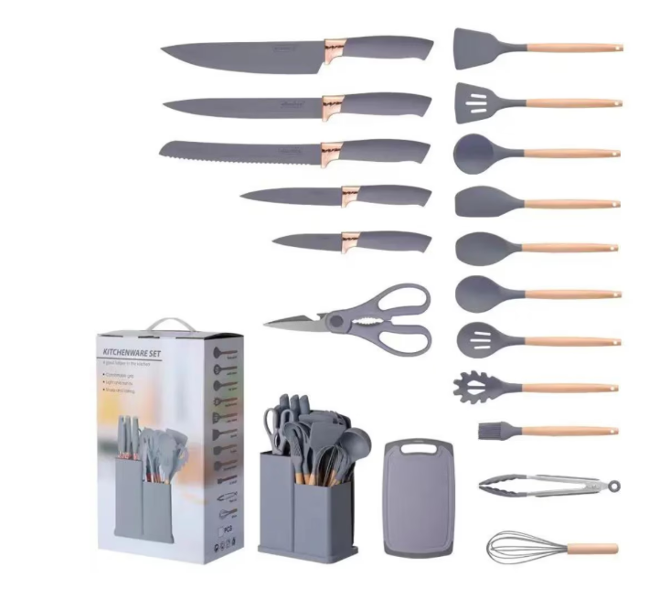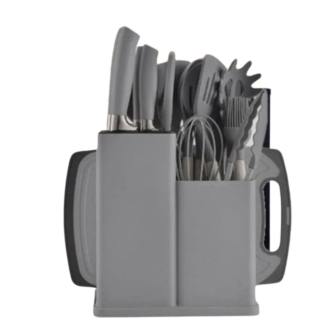 Setul conține toate ustensilele esențiale pentru gătit și copt: palete, linguri, tel, pensulă, clește, spatule și altele. Cu un design modern și practic, acest set aduce eficiență și stil în orice colț de bucătărie.
