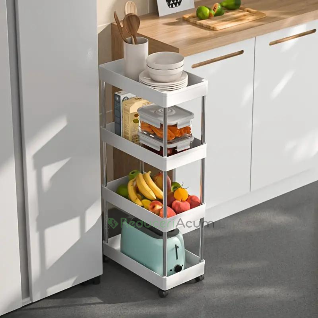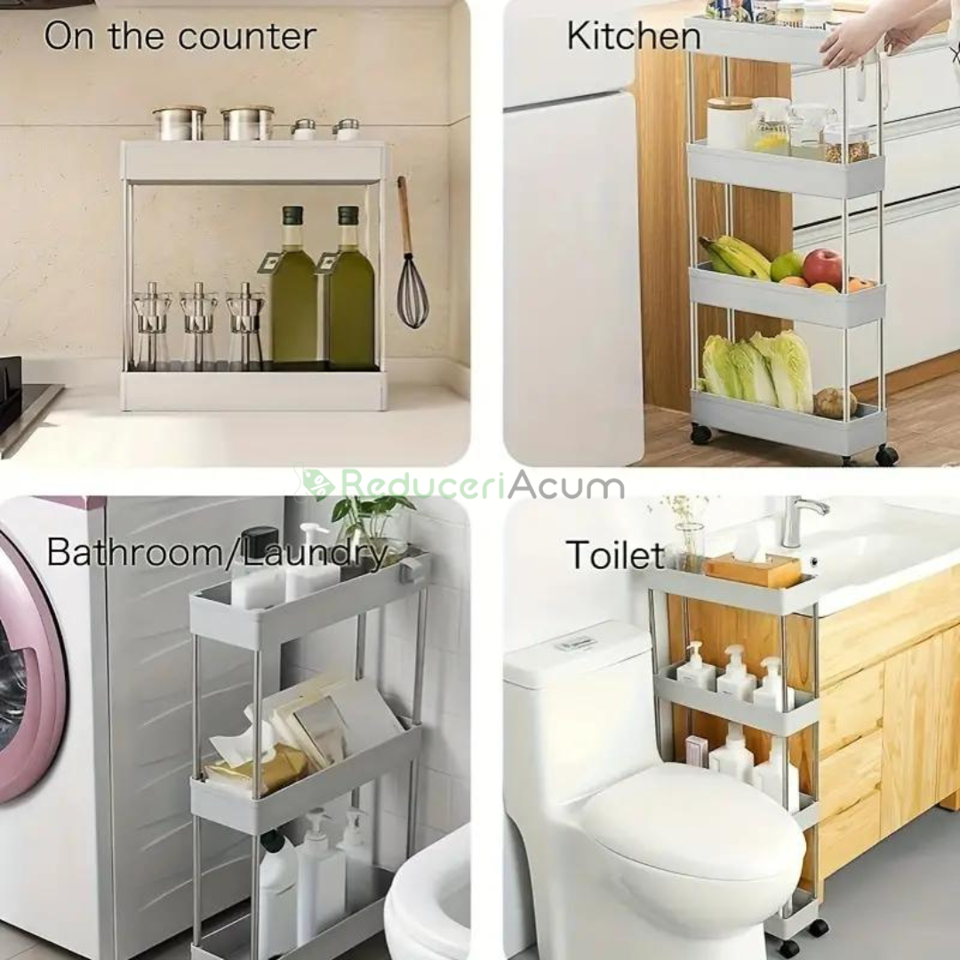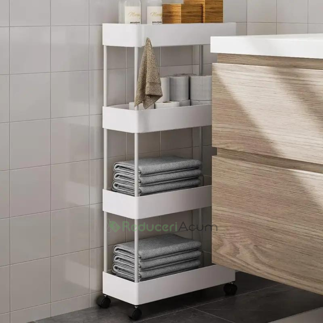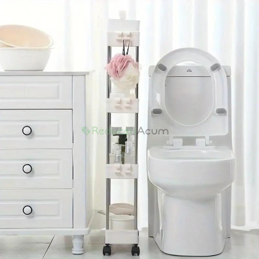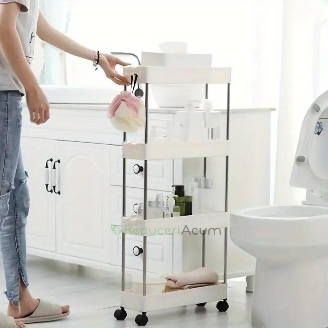 Suportul de depozitare cu 4 rafturi și roti pentru baie sau bucătărie este soluția perfectă pentru organizarea spațiului tău, oferindu-ți beneficii remarcabile: