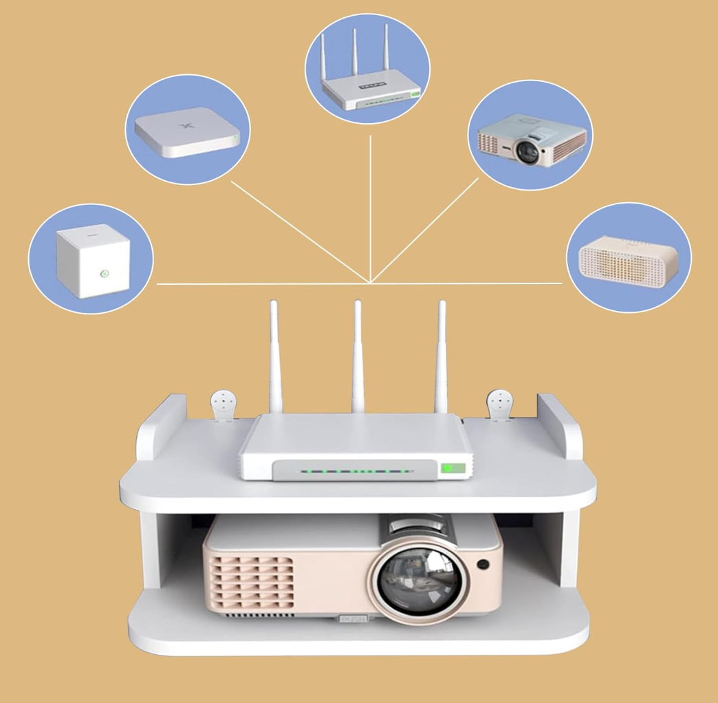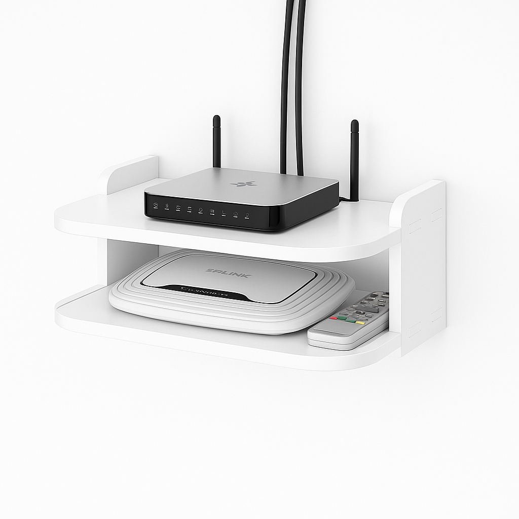 Această etajeră modernă suspendată pe perete, cu două compartimente spațioase (fiecare de 20x30 cm), este special concepută pentru a susține routere, modemuri și alte dispozitive electronice mici. Cu un design alb minimalist, se potrivește perfect în orice decor — ideală pentru sufragerii, birouri sau holuri.