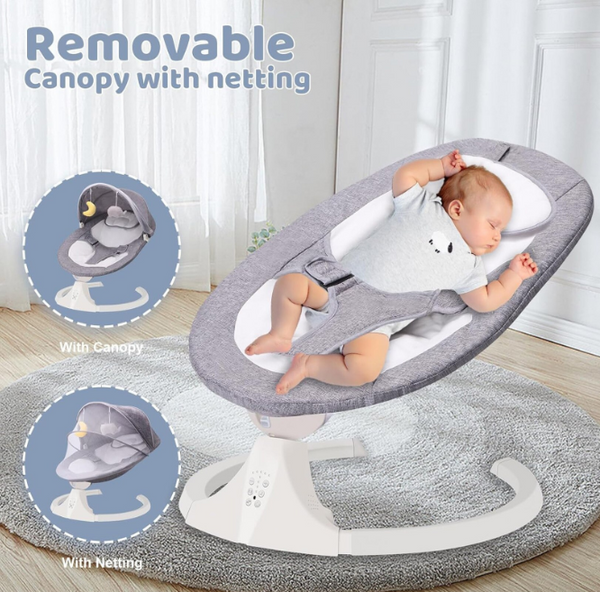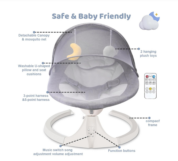 Leaganul electric pentru bebelusi oferit este creat pentru a asigura confort, siguranta si relaxare inca din primele luni de viata, fiind un sprijin ideal pentru parinti in momentele de odihna ale copilului. Dotat cu sistem de leganare automata, acesta reproduce miscari line si constante care calmeaza bebelusul si il ajuta sa adoarma natural. Vitezele reglabile permit adaptarea ritmului in functie de preferintele copilului, iar timerul integrat asigura utilizare controlata si eficienta.