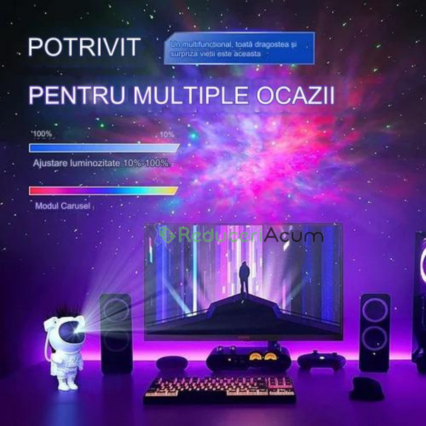 Proiector neobisnuit cu stea LED în formă de astronaut. Laserul încorporat permite proiectarea stelelor sau galaxiilor în până la 8 moduri. Capul rotativ (360 de grade) vă permite să proiectati proiectia într-un plan larg si cu o rază lungă de actiune. Luminozitatea LED-urilor, precum si viteza de rotatie si timpul de functionare pot fi reglate. Telecomanda IR convenabilă facilitează pozitionarea proiectorului de la distantă. Designul atractiv si multe optiuni de setare îl fac cadou perfect pentru un copil.