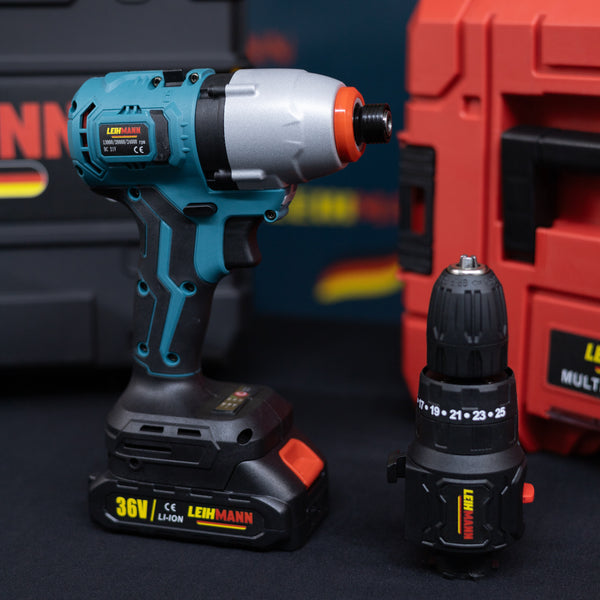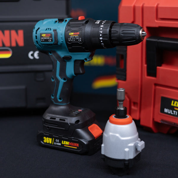 Bormașină fără fir: Motorul puternic de 36V asigură un cuplu ridicat, ideal pentru găurirea eficientă în lemn, metal și plastic. Cu viteze variabile și funcție de inversare, oferă control deplin în fiecare aplicație.