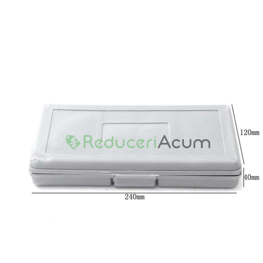 Cutia cu piese si tubulare are astfel asezata dimensiuni foarte practice, aproximativ cat marimea unei carti de citit, fiind astfel usor de transportat sau de asezat in masina, dulap sau in magazie.