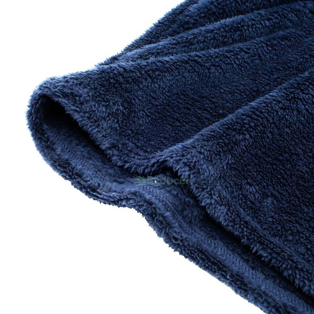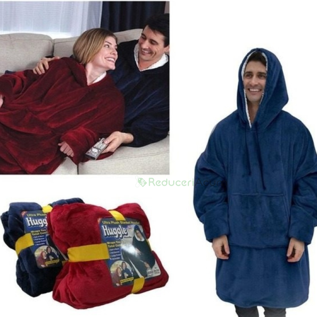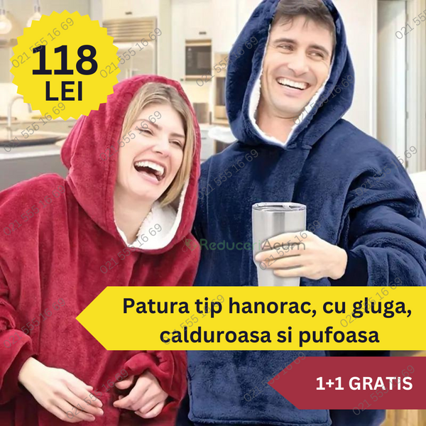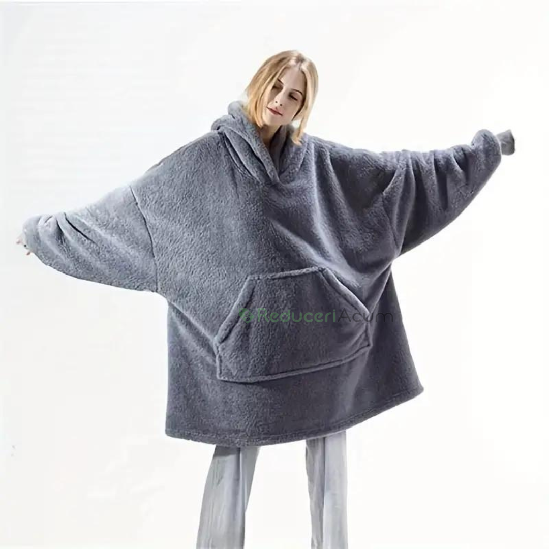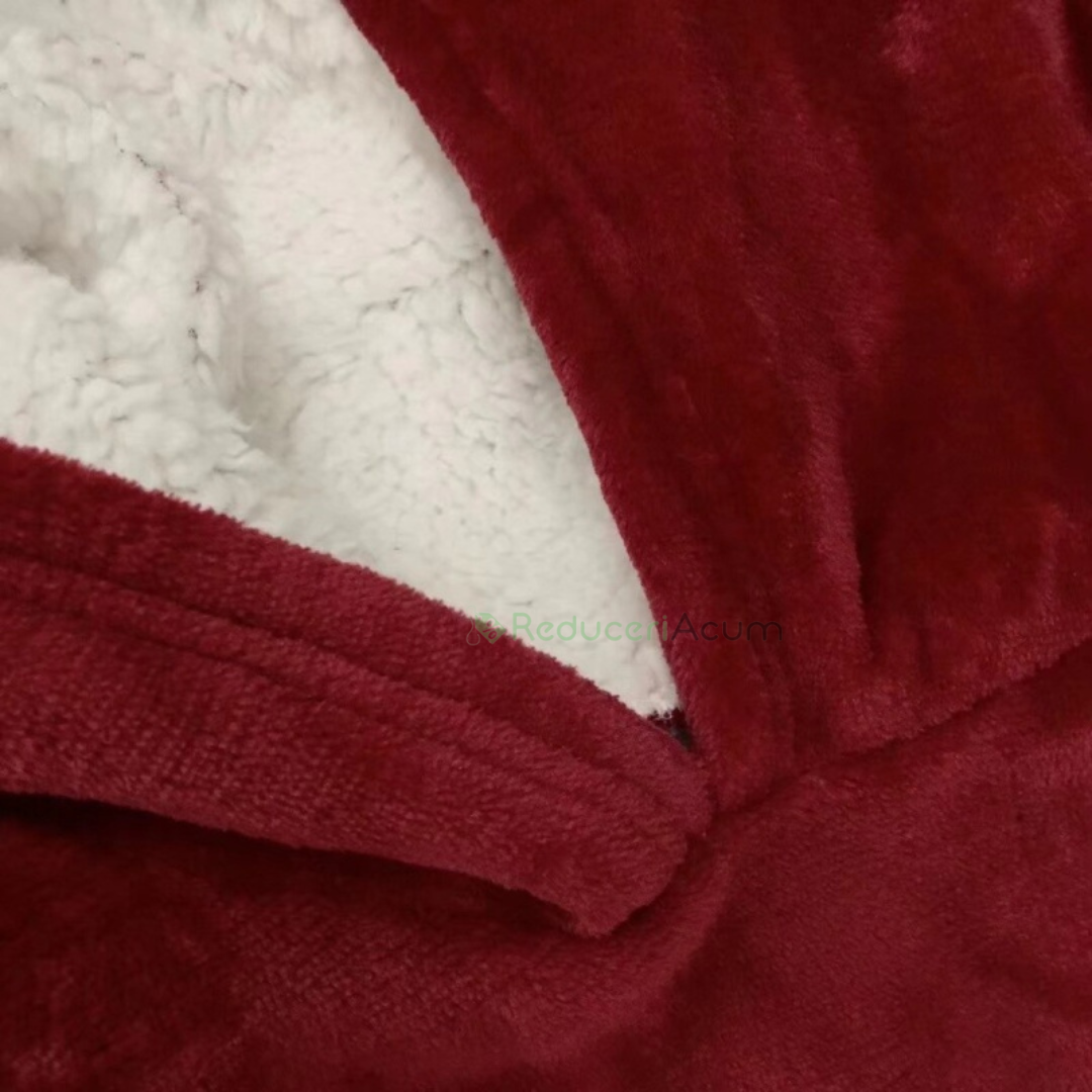 Patura fleece tip hanorac cu blana, maneci si gluga, extrem de calduroasa si placuta la atingere, cu blana moale si pufoasa.