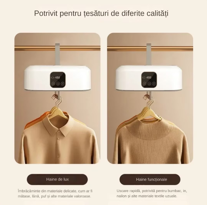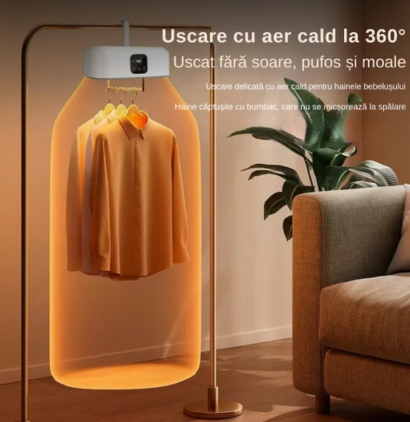 Aparatul este ideal pentru haine din bumbac, camasi, articole subtiri sau imbracaminte pentru bebelusi, oferind o uscare blanda care previne deteriorarea sau micsorarea materialului. Designul vertical permite asezarea mai multor articole simultan, economisind timp si spatiu. Invelisul protector creeaza un mediu inchis, mentinand temperatura optima si accelerand procesul de uscare indiferent de sezon sau de conditiile atmosferice.